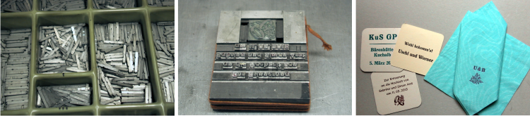 Wir fertigen für Sie mit Hand gesetzte Visitenkarten, Einladungen, Hochzeitskarten auf handgeschöpften Büttenpapier oder spezielle Strukturkartons. Für familiäre Feste Bierdeckel mit Prägung und lustigen Texten, Servietten mit Monogramm-Aufdruck.
