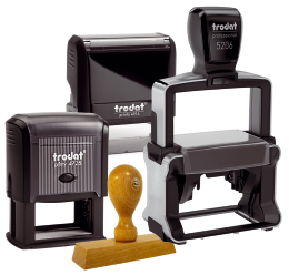 Neben diesen herkömmlichen Stempeln umfasst unsere Produktpalette auch das gesamte Sortiment der Selbstfärbestempel der Firma Trodat.